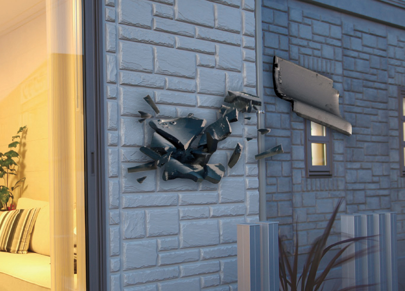 台風の暴風によって、瓦が飛んでしまったり飛来物によって外壁が破損する被害をよく目にします。上写真のように実際にPCパネルに瓦を衝突させる実験では、鉄筋コンクリート住宅のPCパネルに時速30キロで瓦が衝突しましたが、全くの無傷でした。
