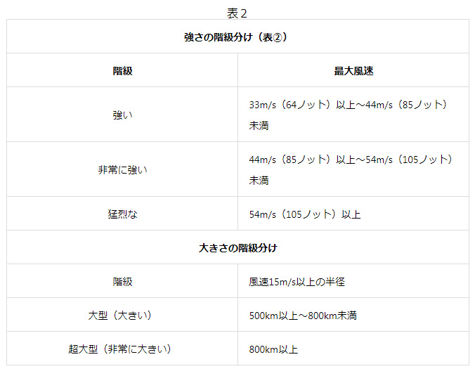 最近、台風発生のニュースを聞いていると「非常に大型で猛烈な台風です」というような表現がされますが、これは気象庁によると台風の勢力は「強さの階級」と「大きさの階級」(下の表2)によって決まるとされています。