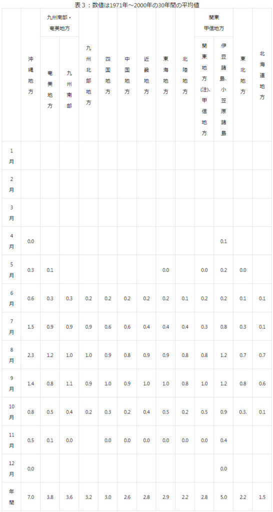 加えて、表3は地方ごとの台風の上陸数の30年間の平均数を表したものですが、上陸数の少ない北海道や極端に多い沖縄を除いたとしても年間2.2個~3.8個の台風が上陸します。
