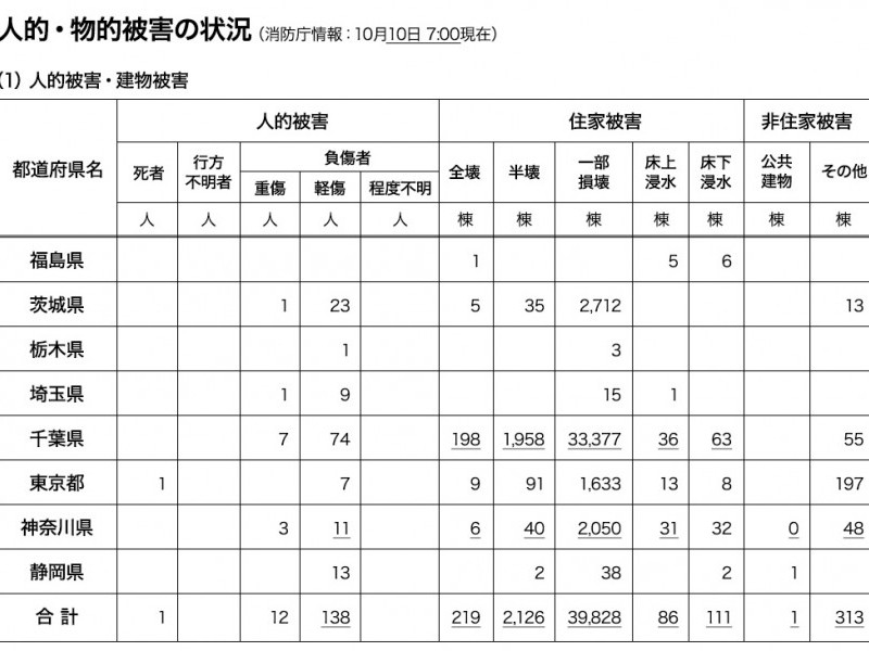 下記は台風15号の被害状況だが、4万棟以上の住宅が被害に遭っている。11月9日(土)千葉県館山市で一般社団法人 防災住宅研究所主催の「防災対策セミナー」を開催させていただいたが、出席者の半数は台風15号によって自宅が損壊した方たちで、あるご夫婦は「全壊です。連絡手段が携帯電話しかない状態で、これから家をどうしていくか、緊急の問題でセミナーに参加しました」と切羽詰まっている状況であった。
