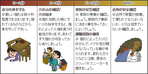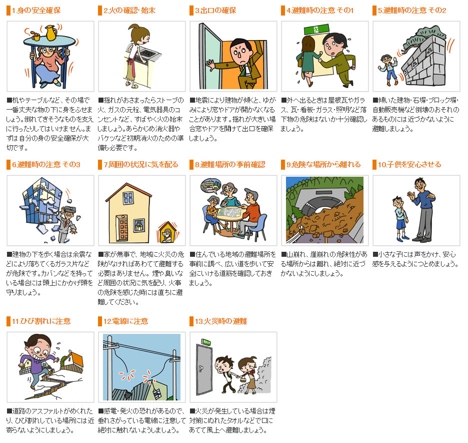 地震発生時にとるべき行動をまとめました。いざという時に何をすべきかを再確認しておきましょう。