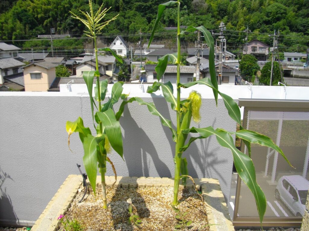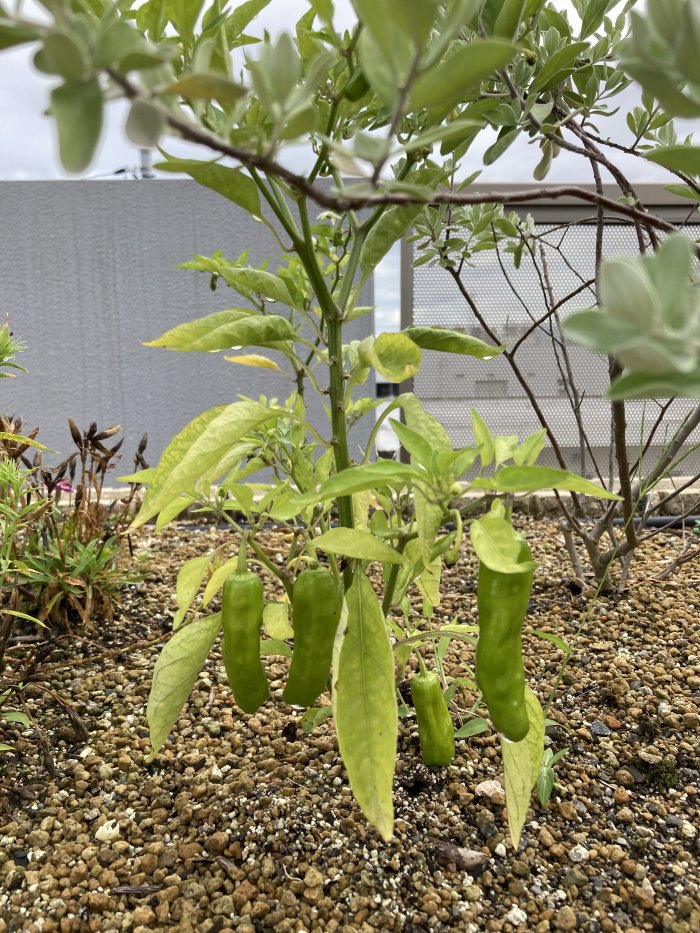 百年住宅の屋上では、オクラ・ししとう・大葉・トマト・ナス・トウモロコシを栽培中です。