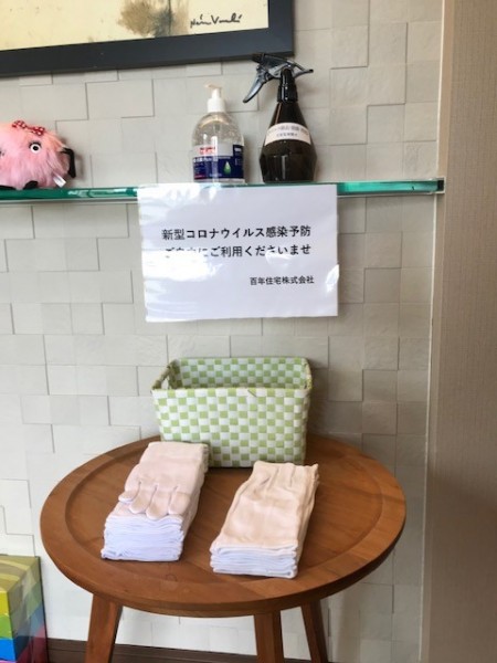 私たち百年住宅スタッフは、マスク・手袋着用、消毒液をご用意して、安心してご見学いただけるよう細心の準備をしております。