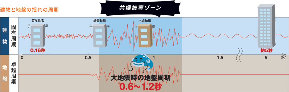 地盤の揺れには特有の周期があり、大地震の場合には0.6秒から1.2秒の間にその周期があるとされています。地盤特有の周期と、建物の固有周期が一致した時に、揺れの方向が同調し、通常をはるかに上回る増幅された力が建物に加わります。これを共振現象とよび、建物の倒壊を引き起こします。百年住宅の固有周期は0.16秒と非常に短いので大地震の地盤特有の周期には同調しにくい構造です。一方、軸組構造の場合は、両者の周期が近く、共振現象が起きやすくなります。