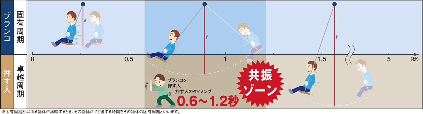子供の頃、ブランコに乗って揺れに合わせてこぐ(あるいは、押してやる)と次第に揺れが大きくなることは誰にでも経験があることでしょう。これはブランコの固有周期とブランコをこぐ周期が合っているためです。このように、固有周期に合わせて周期的に力を加えると揺れが増幅されて大きくなっていく現象を「共振」と呼びます。共振すると小さな外力でも大きな振動となり、共振しなければ大きな外力でも振動は大きくなりません。