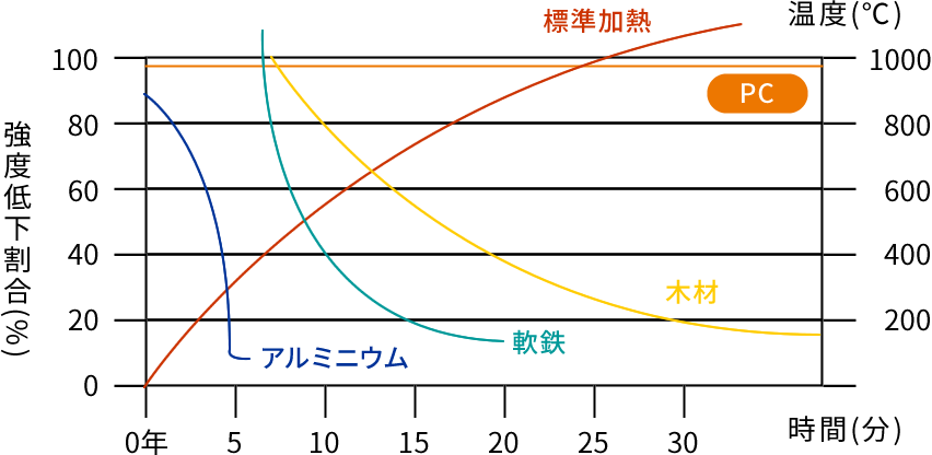 これに対してコンクリート(PC)強度は、ほとんど変わらず火に強い最適な構造材料と言えます。