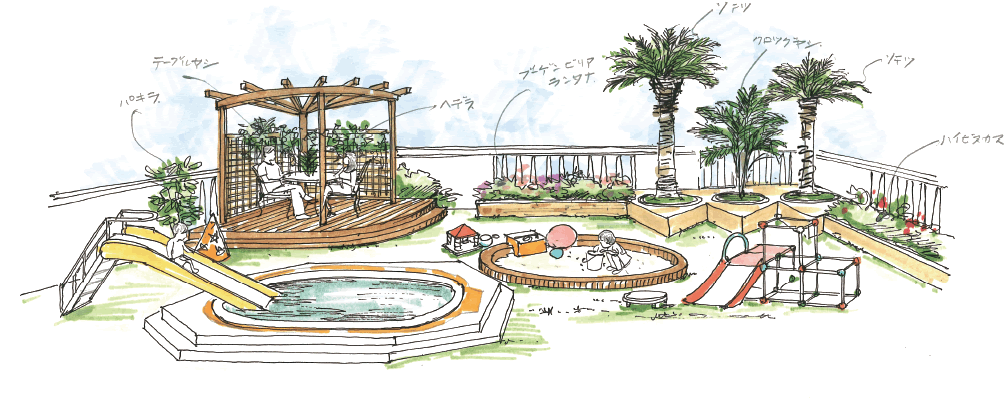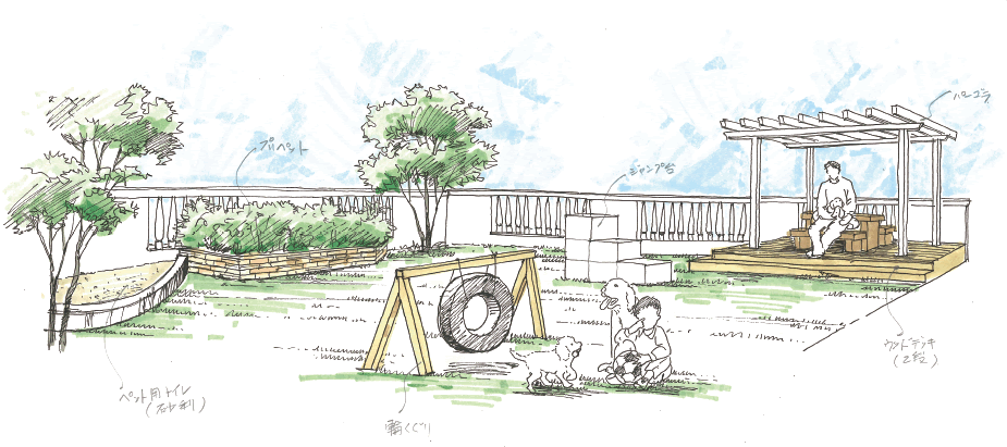 緑と風が大好きなワンちゃんのために、屋上からの最高のロケーションに囲まれたドッグランはいかがですか?家に居ながらも芝生と草木に囲まれた広々空間で愛犬とふれあう大切な時間が生まれます。