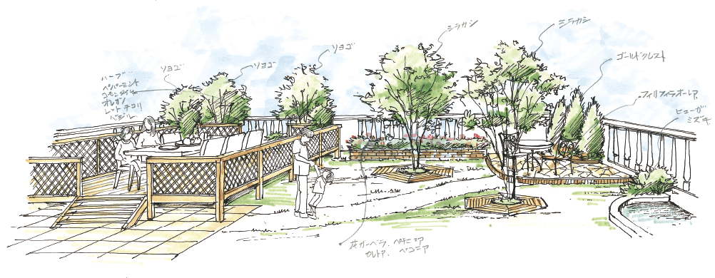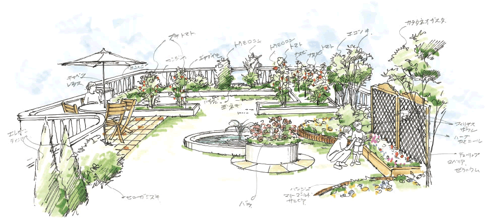 人の心をなごませ、やすらぎを与えてくれる庭に緑のある暮らし。みずみずしい自家製野菜を楽しむ家庭菜園、豊かな季節の実りを楽しむ果樹園、香りと味わいを楽しむハーブ園、季節の花々に包まれたフラワーガーデン等、あなただけのオリジナル屋上菜園・園芸を楽しんでみませんか?