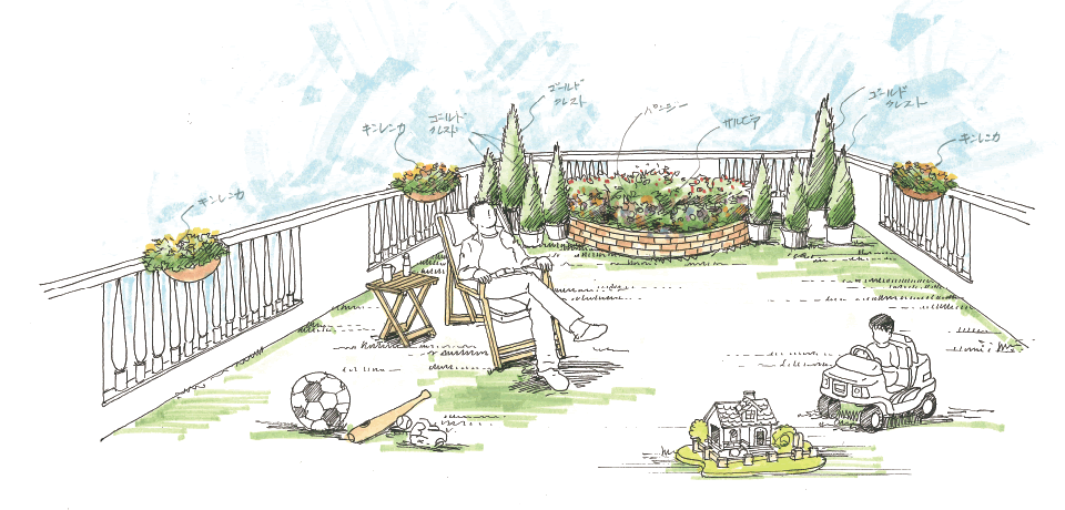 家族だけのプライベートスペースで四季折々の草花を楽しむスカイガーデン。屋上緑化はヒートアイランド現象の解消としても注目されており、芝を屋上全面に敷き詰めることで高い断熱効果を発揮。冷暖房費を抑え、光熱費の削減に繋がります。