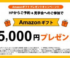 | 期間 | 8月28日(水)~10月31日(木) | 備考 | ※ Amazonギフト5000円のプレゼントは1名様(1家族様)1回限りとさせて頂きます。※ アンケートにご協力頂くことがプレゼントのご条件とさせて頂きます。※ 住宅購入を検討している方、弊社お客様リストに登録のない方に限ります。※既にお客様名簿にご登録のあるかたへはAmazonギフト1,000円をプレゼントいたします。 ※ 未成年者様のみのご来場は対象外とさせて頂きます。※ ご本人様確認のため、身分証明書の提示をお願いする場合がございます。※ Amazonギフトコードは、ご来場いただいた後メールにてお送りします。※他サービスとの併用はできません。※その他詳細は見学会場でご確認ください。※キャンペーン主催:百年住宅(株) AmazonはAmazon.com, Inc.またはその関連会社の商標です。 |