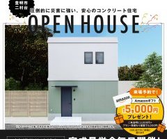 | 期間 | 5月13日(月)~7月17日(水) | 備考 | ※ Amazonギフトのプレゼントは1名様(1家族様)1回限りとさせて頂きます。※ アンケートにご協力頂くことがプレゼントのご条件とさせて頂きます。※ 住宅購入を検討している方、弊社お客様リストに登録のない方に限ります。過去にご来場または応募実績のある方は対象外とさせていただきます。 ※ 未成年者様のみのご来場は対象外とさせて頂きます。※ ご本人様確認のため、身分証明書の提示をお願いする場合がございます。※ Amazonギフトコードは、ご来場いただいた後メールにてお送りします。※他サービスとの併用はできません。※その他詳細は見学会場でご確認ください。※キャンペーン主催:百年住宅(株) AmazonはAmazon.com, Inc.またはその関連会社の商標です。 |