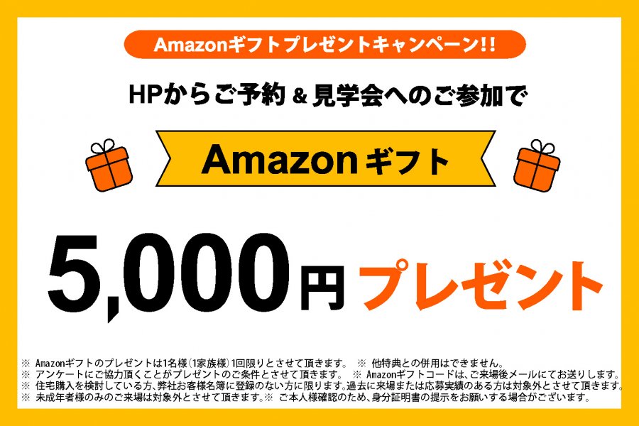 | 期間 | 10月12日(土) | 備考 | ※ Amazonギフトのプレゼントは1名様(1家族様)1回限りとさせて頂きます。※ アンケートにご協力頂くことがプレゼントのご条件とさせて頂きます。※ 住宅購入を検討している方、弊社お客様リストに登録のない方に限ります。過去にご来場または応募実績のある方は対象外とさせていただきます。 ※ 未成年者様のみのご来場は対象外とさせて頂きます。※ ご本人様確認のため、身分証明書の提示をお願いする場合がございます。※ Amazonギフトコードは、ご来場いただいた後メールにてお送りします。※他サービスとの併用はできません。※その他詳細は見学会場でご確認ください。※キャンペーン主催:百年住宅(株) AmazonはAmazon.com, Inc.またはその関連会社の商標です。 |