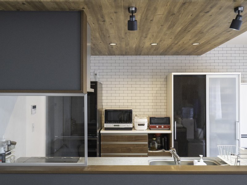 奥さまの一番のこだわりがキッチン。シックな色合いでコーディネートされた大人のキッチン空間です。壁面のグレーがアクセントになり、LDK空間全体がしまって見えます。ダークカラーではありますが、天井の木目やウッディーなシェルフと美しく調和し、柔らかい雰囲気を演出していますよね。
