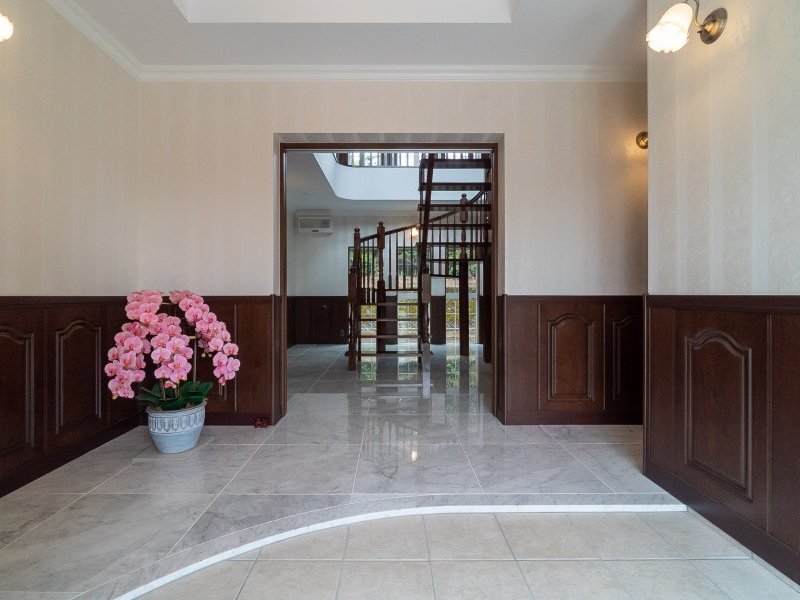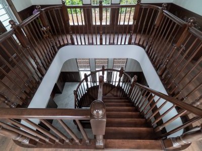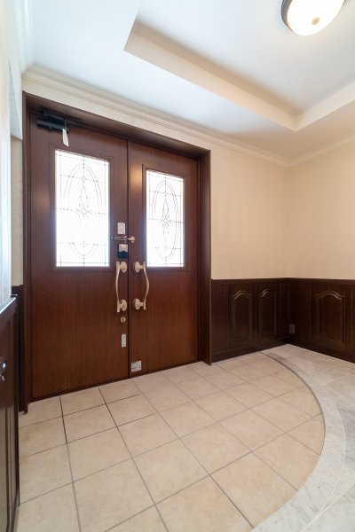 重厚感のある両開きのドアを開けると、大理石が敷き詰められたエントランスホールが広がります。その先には優雅な曲線を描くらせん階段が。階段そのものがエントランスを個性的に彩るインテリアになっています。上り下りするたびに壮大で優雅な気分を味わえそうです。