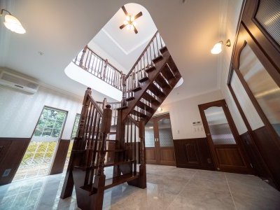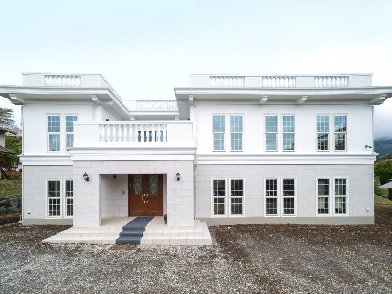 まるでお城のような佇まいの白亜の洋館。周囲の自然とのコントラストは絵のような美しさです。吹き抜けのらせん階段をはじめ、随所にモールディングや優美な曲線を施すなど、内装もクラシカルなデザインを追求。