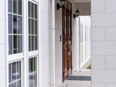 外観の演出の鍵を握るのは、リズミカルに配置された格子窓。華美な装飾はせずとも、タイル貼りの外装やモールディング、バルコニーのクラシカルな手すりが高級感を醸し出しています。