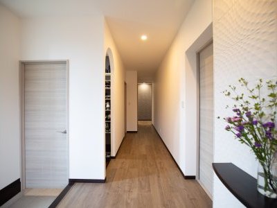 さらに、玄関正面にシューズクロークを設置。扉でシューズクロークの中が見えないため、玄関まわりがすっきりした印象に。急な来客にも慌てずにすみます。