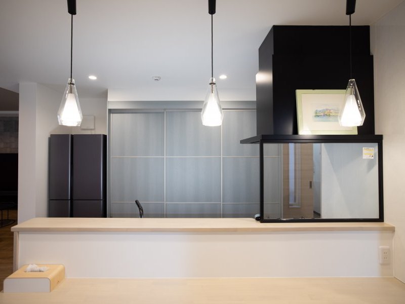 キッチンは壁付けのペニンシュラ型をチョイス。目隠し壁の向こうが廊下になっているため、ぐるりと回れるアイランドキッチンのような広がりを手に入れることができます。