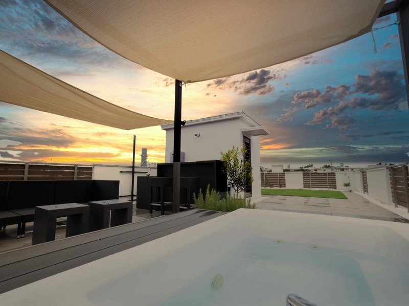 愛鷹山とその向こうに雄大な富士山を望むことができるAさま邸。この恵まれたロケーションを生かして、旦那さまの念願だった屋上露天風呂をつくりました。屋上にはジャグジーのほかにも、バーカウンターやソファーもあり、バリのリゾートヴィラを彷彿させる癒やしの空間に。わざわざ遠くの温泉やスパに行かずとも、日常から切り離された時間を満喫できます。