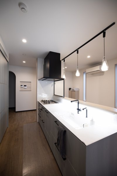 キッチンは壁付けのペニンシュラ型をチョイス。目隠し壁の向こうが廊下になっているため、ぐるりと回れるアイランドキッチンのような広がりを手に入れることができます。