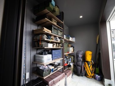 「屋外で使った道具など、汚れたものをそのまま収納できるので重宝しています。ガレージにもつながっているので、大きな荷物の積み下ろしもラクですね」(旦那さま)