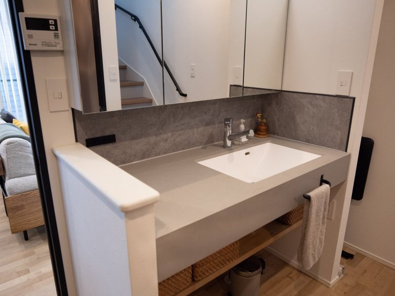 「この無機質なグレーの洗面台を使いたいと、設計士さんにわがままを聞いてもらいました。ここまで広い洗面台は初めてで、妻と並んで使えるので、忙しい朝もとても快適です。将来、家族が増えても、渋滞する心配はなさそうです」(ご主人)。