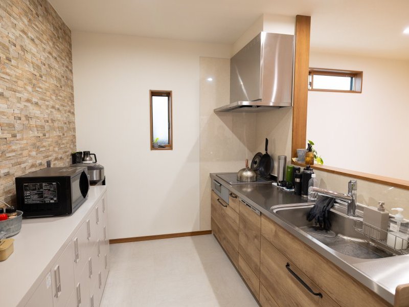 素材選びでも、おふたりのこだわりが随所に光ります。シューズクロークやファミリークローゼット、キッチン背面の収納スペースには、DIY対応の壁材「デュライク」を採用。棚やフックを自由に取り付けられるので、暮らしの変化に合わせて空間を柔軟に使いこなすことができます。