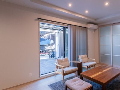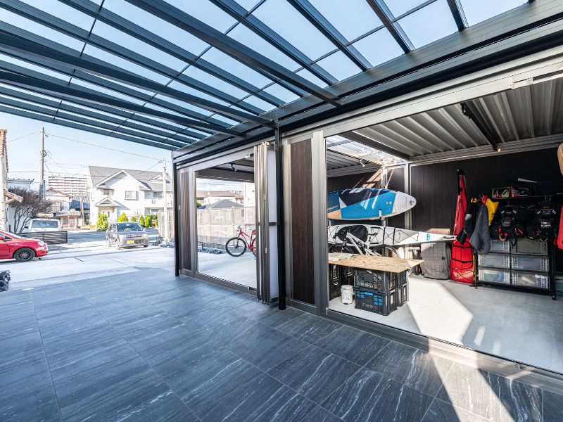 大きく開くサッシを採用し、リビングからガレージを眺められる設計に。さらに、建物との間に屋根付きのガレージポーチを設け、内と外をやさしくつないでいます。車2台分の屋根付きスペースは、雨の日の出入りもスムーズで、趣味道具の手入れにも大活躍!