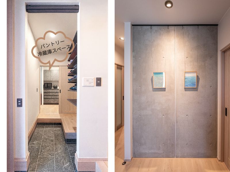 玄関横の土間シューズクロークからパントリー、そしてキッチンへと続く一直線の動線動線。このつながりのおかげで、買い物帰りもスムーズ。リビングを通らずに食品や日用品を収納できる“家事ラク動線”が生まれました。