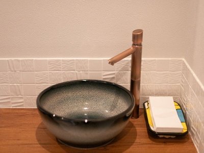 玄関の一角に設けた手洗いは、帰宅後すぐに使える便利さが魅力。玄関からは見えにくい位置にレイアウトし、見た目にもすっきり。コンパクトながら陶器のボウルが程よいアクセントになり、空間を上品に彩っています。
