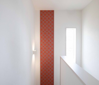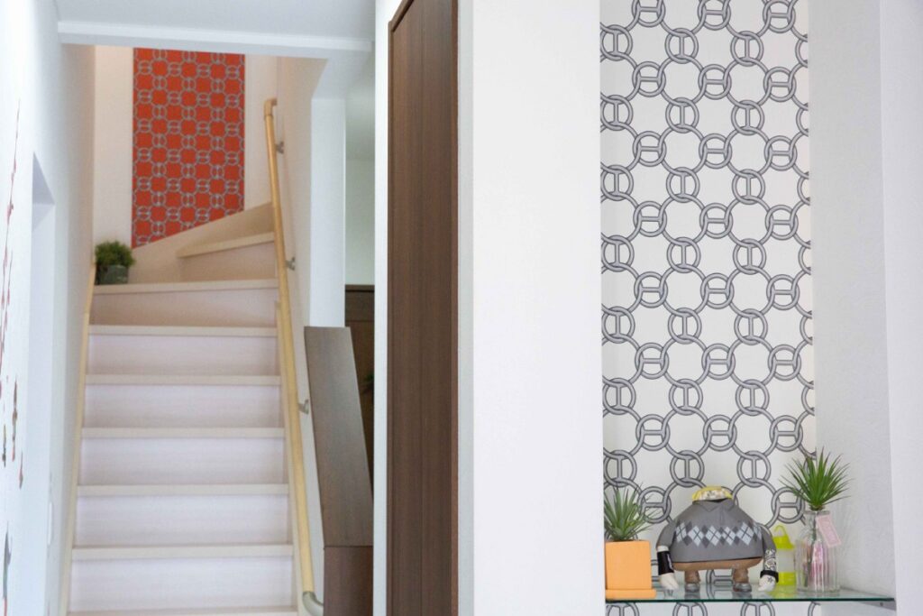 そんなご両親のこだわりの一つ、エルメスの壁紙。ご主人がフランスから直接買い付けたこだわりの壁紙は、玄関内の正面の壁や1F~3Fの階段のアクセントとして、2世帯住宅で階ごとに分けてプライベートを確保しながら、全ての階の階段を上品な雰囲気で統一してあります。