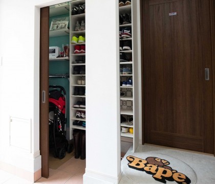 玄関のシューズクロークは、たくさんの靴だけでなく、傘やコート、お孫さんのベビーカーなどいろいろ収納できて魅力的です。