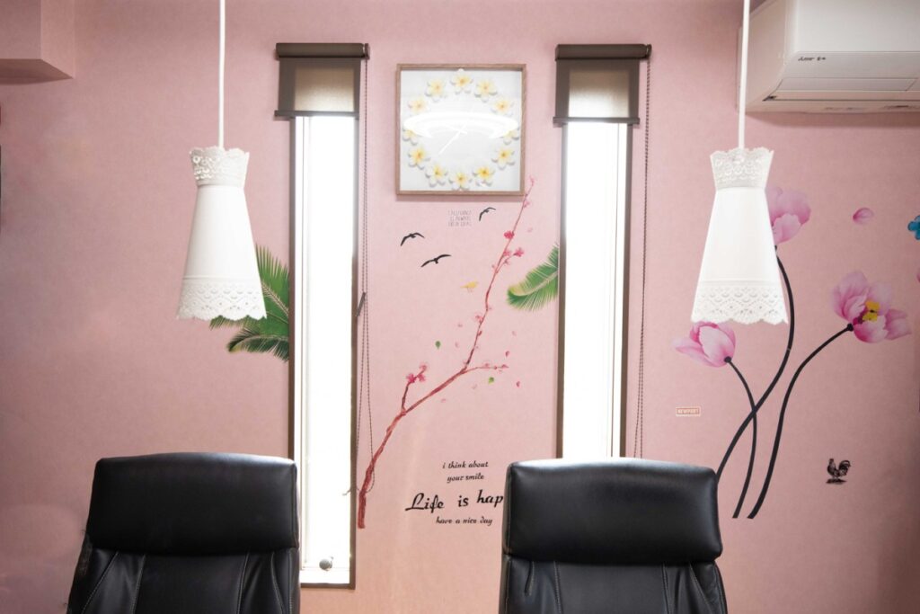 1Fのご両親のダイニングの一角はピンクの壁紙と茶色い格子模様の天井でエキゾチックな雰囲気に。「カウンターで二人でテレビを見ながらゆっくり御飯をたべたり話したり落ち着く空間です。2階で孫が走り回っても全く音が響かないからゆっくりできます。」