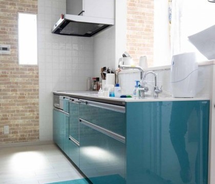 2F若夫婦のダイニングは、南フランス プロヴァンス地方を思わせるかわいらしい雰囲気に。若奥様が一目惚れしたという鮮やかなブルーのキッチンに純白のタイル。「使いやすさや掃除のしやすさは勿論ですが、雰囲気が大好きで毎日キッチンに立つのが楽しくてたまりません。」