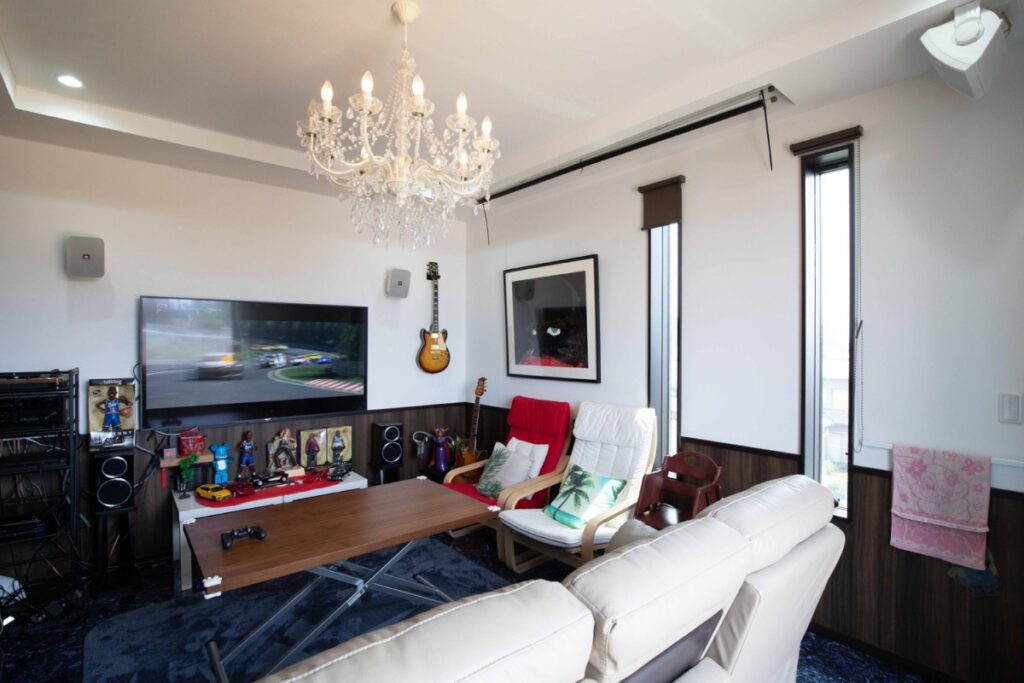 ご主人様自慢の3Fのシアタールーム。「映画は勿論、家族でゲームやカラオケも楽しんでいます。防音扉以外は何も防音対策はしていませんが、遮音性が高く外に音が漏れないから大音量で楽しんでいます。すぐ横のテラスからは駿河湾も一望できます。