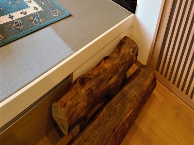 ダイニングの横はけやき柱の床の間や折り上げ天井の照明、建て替え前の家の梁で作った階段等、木に囲まれたくつろぎの空間となっております。さらに、「真冬の寒い時でも室内はエアコンをかけなくても暖かい」とおっしゃっており、外気に影響されない百年住宅のメリットを実感している様子です。