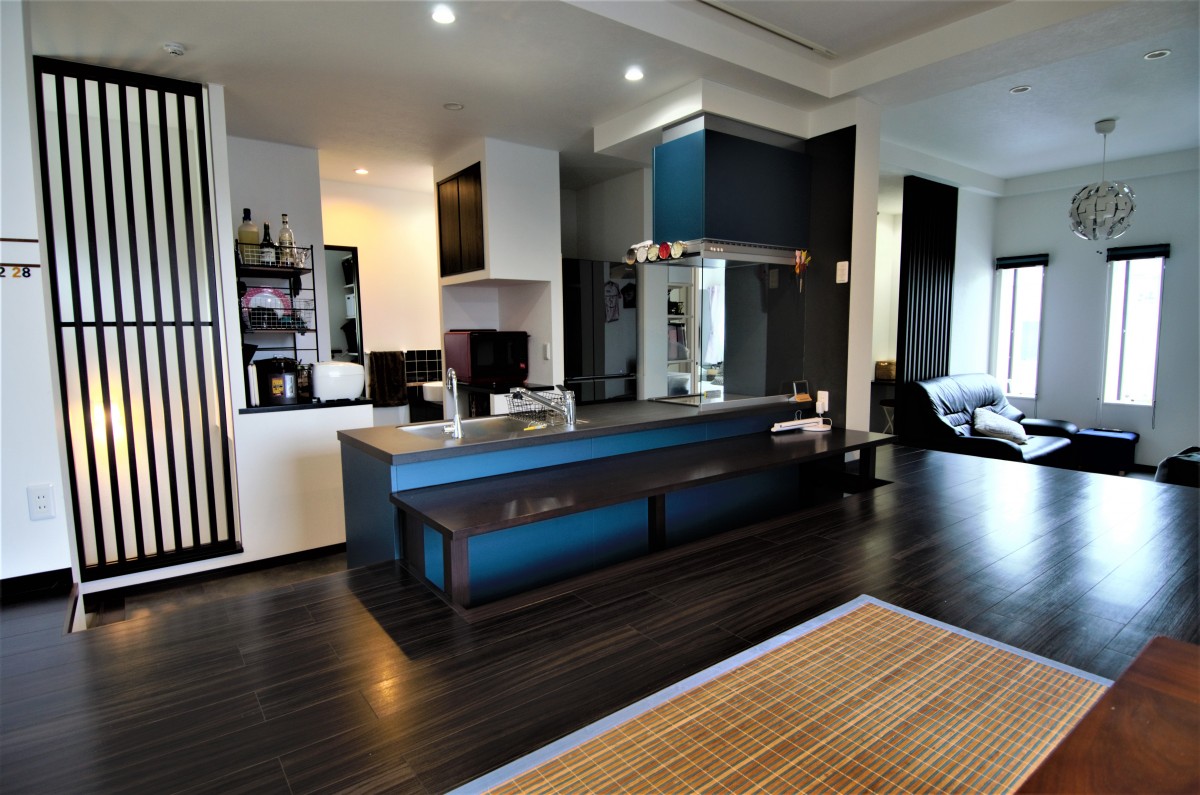 部屋の扉や壁も取り払って、一つの大きな空間にしてみました」その他にもセラミック天板のキッチンとキッチン下のタイル、床下収納やそれを利用したキッチンカウンターなど、随所に息子さんのこだわりが感じられ、モデルルームのような魅力的な空間となっております。