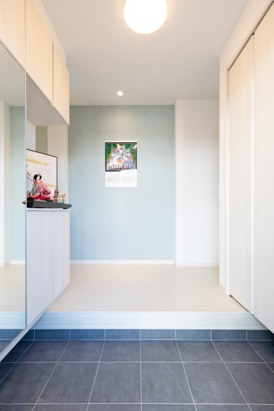 家族がもっともリラックスできる空間にするために、リビングにもこだわられました。リビングは鮮やかなブルーの壁に映える特注のテレビボードと超大型テレビ、そしてその前には広々としたスペース。壁紙の色は最後の最後まで迷われたそうで、「少し派手かなと思いながら決めたブルーグリーンに今はとても満足している」とI様。