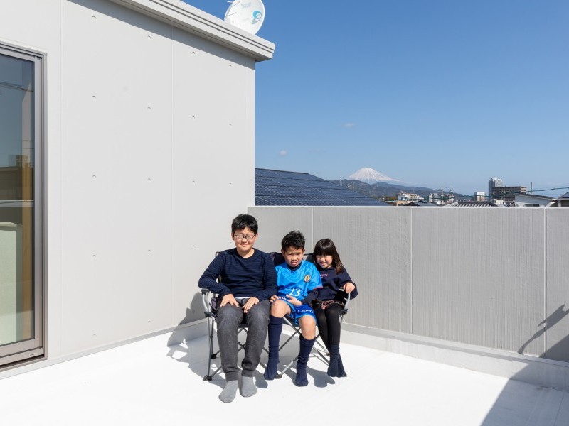 「あっちを見てみて」とお嬢さんが指さす方向には屋上からの絶景の富士山も見えます。荷重制限のない百年住宅の屋上のメリットを十分に活かして、贅沢な空間と時間を満喫されていらっしゃいます。