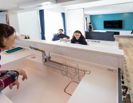 LDKが一つの広々とした空間となっていることに加え、オープンキッチンを採用したことで、何をしていても、ちょうど良い距離感で常に家族とのつながりを感じられる心地よく素敵な空間になりました。