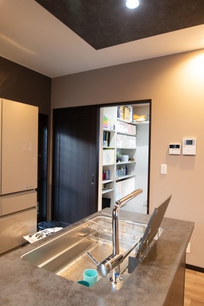キッチンの横には3帖もある納戸を配置。「最初は洗面浴室の予定でしたが、設計の方から『キッチンや食卓を常にすっきりさせたいなら、キッチン横に納戸を設けるといいですよ』とアドバイスいただきました。水回りの動線を優先させることと悩みましたが、納戸にして大正解でした!」と奥様がおっしゃるようにキッチン横の大収納は、常にすっきりしたキッチンを保つのに、大活躍しているようです。