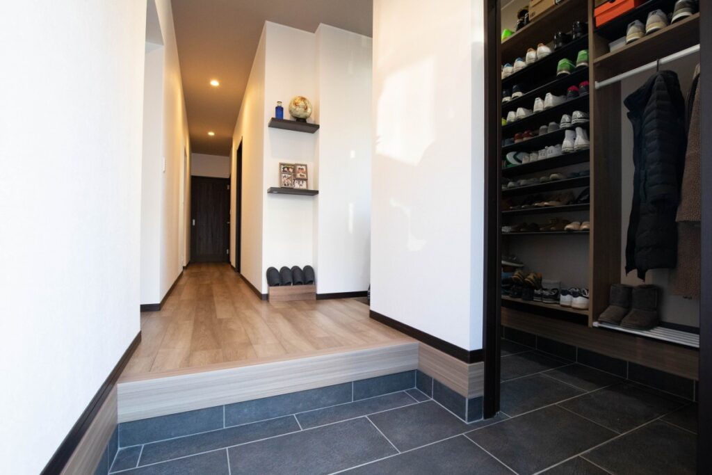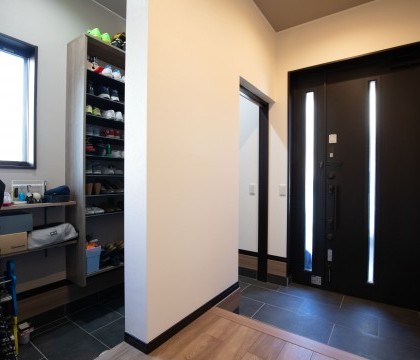 「子供たちのサッカーの道具等をすぐに取り出せるようにしたい」「玄関も常にすっきり見せたい」とご夫婦の希望から、靴箱は設けず玄関横にシューズクロークを配置。ジャケットやサッカーボール、アウトドア用品なども収納できる大収納を実現しました。通り抜けできるクロークで使い勝手もよく、玄関には物が無く綺麗な状態を保てていて、収納と実用性、そして見た目にもご満足いただけている様子です。