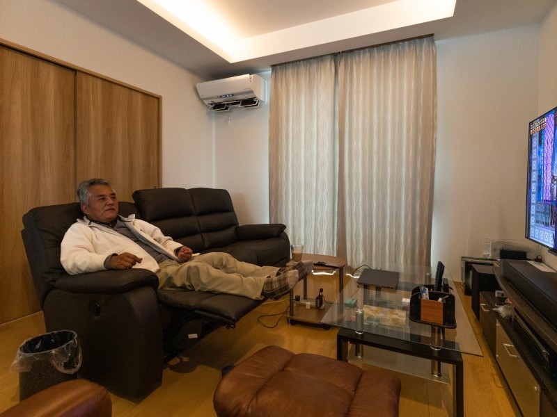 映画鑑賞の趣味をお持ちのA様は、コンクリート造の高い防音性能を活かして、リビングルームをシアタールームのようにすることを考えられていました。窓の大きさや採光、天井の間接照明なども細かくアレンジし完成したリビングには、有機EL55型TVと臨場感をたっぷり楽しめる充実した音響設備、そして身体を投げ出せしてくつろげる大きくて快適なリクライニングソファーを設置。