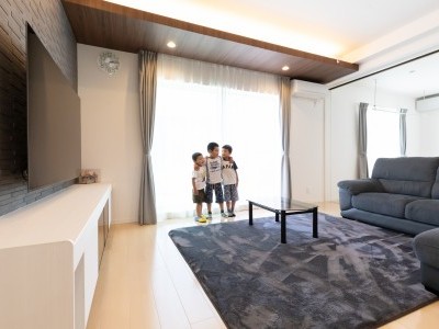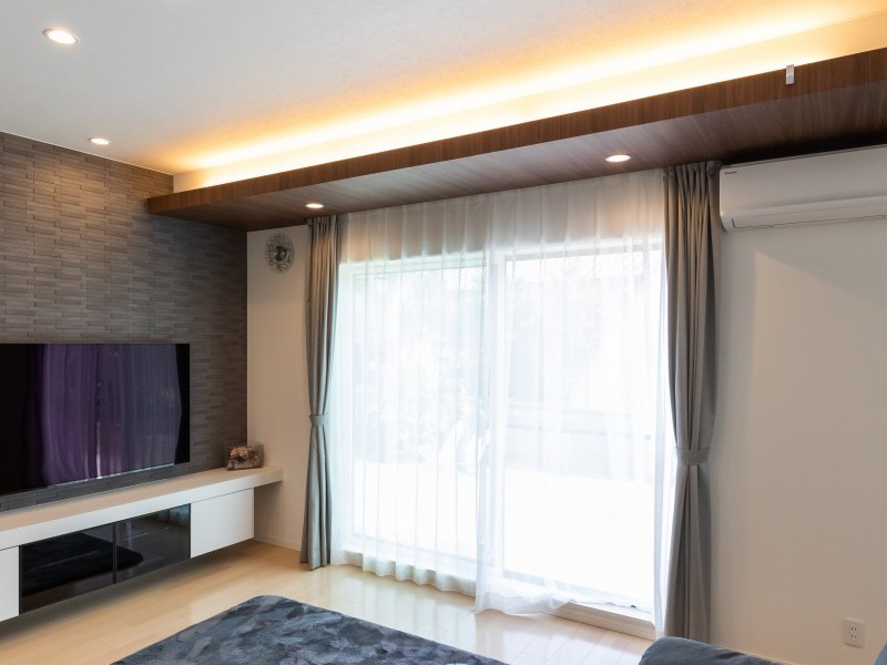 M様こだわりのリビングの折り上げ天井の一部には木目調の化粧梁を飾り、間接照明でエレガントに演出。真横の大きな窓には天井付けカーテンをセレクトし梁との一体感を演出。ダイナミックでありながら大人の雰囲気も感じられるデザイン性に優れたリビングにもご満足いただけている様子でした。