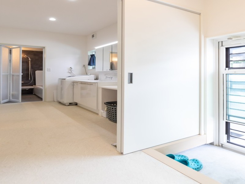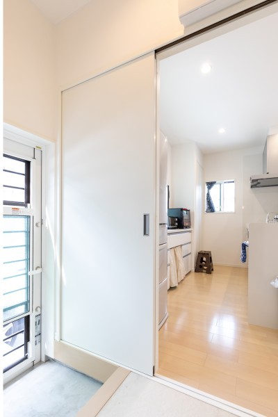 奥様のご要望により、キッチン横の勝手口を、キッチンと洗面スペースとの間に配置。これが大正解で、サッカーから帰られたお子様が勝手口から直接洗面スペースにアクセスできるため、汚れていても掃除も洗濯も楽々。