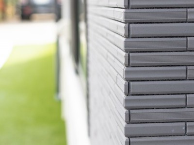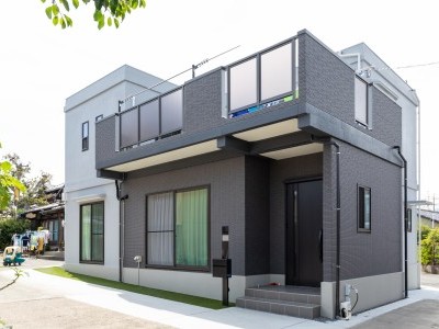 外観はダークグレーのタイルを張り、コンクリートとのツートンカラーで重量感のあるスタイリッシュな雰囲気に。テレビ背面の壁にも同様のタイルを張り、外観と内観の統一感を演出。そのスタイリッシュな雰囲気からは想像できない程、家事がラクになる効率的な間取りを採用。考え抜かれた採光性からも、ご家族のことを想って暮らしやすさを追求した空間であることがわかります。