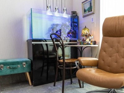 ご夫妻の趣味でもある大きな熱帯魚の水槽は他の家具の配置を考えながら決めたそうで、「基礎がしっかりしているから、重量のある水槽も補強なしで好きなところに置けるのが本当に嬉しい」とM様がおっしゃる通り、床下は砂利とコンクリートで埋められていて床下空間が無いから重たいものを載せても全く問題ありません。