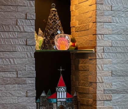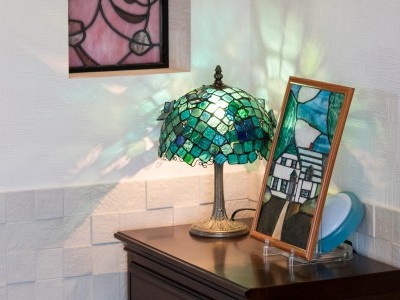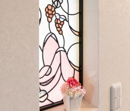 玄関に入ると目の前には、アンティーク家具が並ぶ広々とした来客スペースが広がります。真横にある重厚で上品なステンドグラスのドアの向こうは、奥様が経営される美容室の店舗に。店舗内もステンドグラスやアンティーク調のランプなど奥様こだわりのインテリアによって豪華な雰囲気が演出されています。