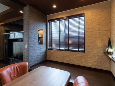 階段を上がって目に入ってきたのはダークカラーの落ち着いた色調で統一されたリビングダイニング。百年住宅の特徴である高い天井に加え、折り上げ天井を採用したことにより、さらに広さ感じられる空間に。M様ご自身で貼ったエコカラットのタイルもアクセントになり、大人の落ち着いた雰囲気のリビングダイニングとなりました。