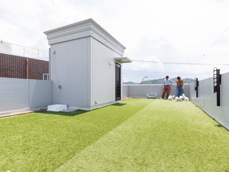 横長の敷地をうまく利用し、ワンちゃんたちが十分に走れる直線距離を確保した屋上は、近所の目を気にすることなく、完全なプライベート空間のドッグランとして大活躍。店舗併用住宅で来店者に配慮が必要な場合や、庭に大きなドッグランスペースを確保できない場合には、プライベートを確保できる屋上ドッグランというスタイルは魅力的のようで多くのオーナー様にも選ばれています。